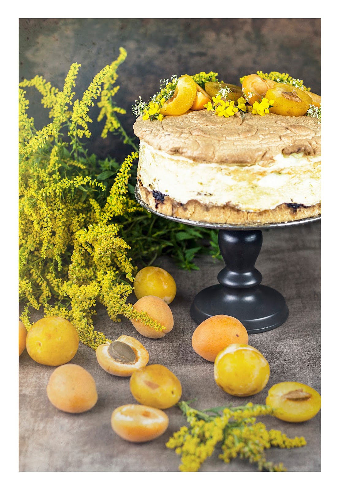8. Ciasto studzimy dokładnie. Tuż przed podaniem układamy na wierzchu przekrojone mirabelki i morele.