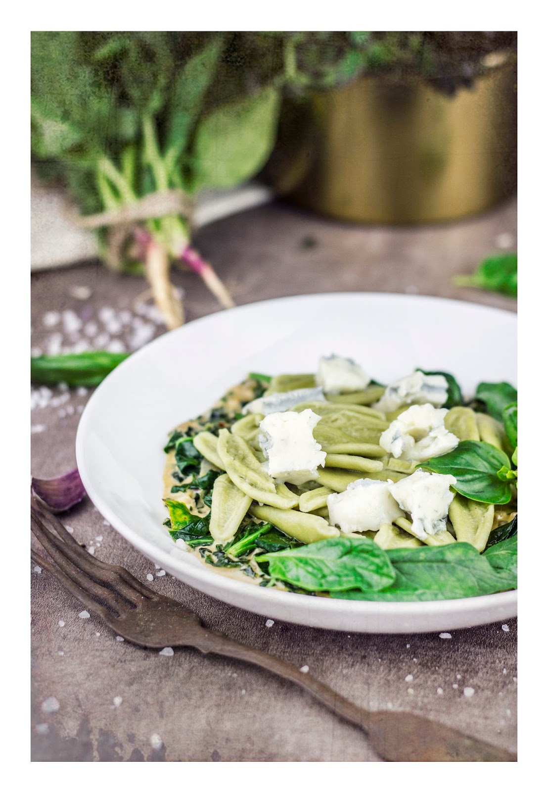 - Szpinak dokładnie myjemy, oczyszczamy z piasku. Na patelni podgrzewamy łyżkę masła, wrzucamy zgniecione ząbki czosnku, następnie podsmażamy szpinak przez 3 minuty. Dodajemy posiekaną dymkę.